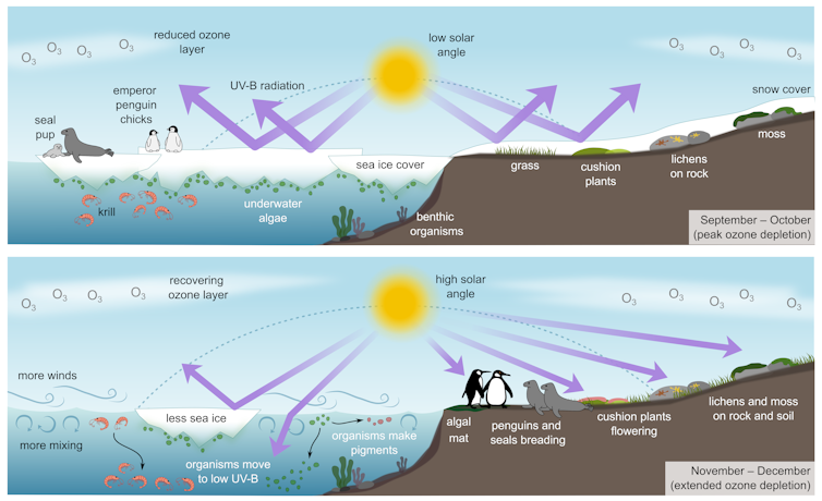 But over the last four years, even as the hole has shrunk it has persisted for an unusually long time. Our new research found that instead of closing up during November it has stayed open well into December. This is early summer – the crucial period of new plant growth in coastal Antarctica and the peak breeding season for penguins and seals.