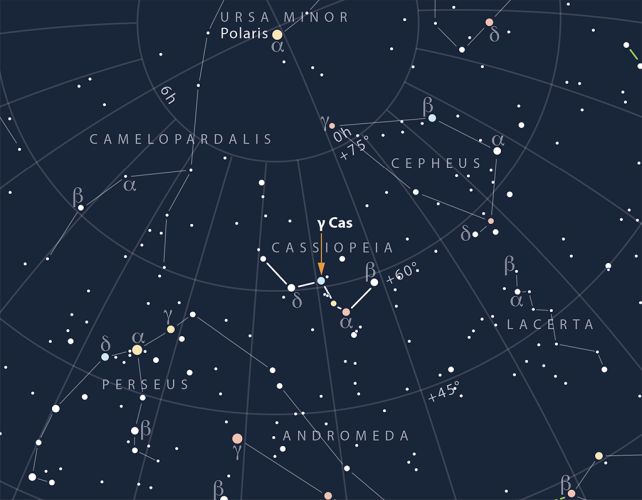 The γ Cas system actually consists of multiple stars locked in an intricate orbital dance, some 550 light-years away at the middle peak of the "W" in the constellation of Cassiopeia. The biggest, brightest star in this system is a blue-white Be-type star around 15 times the mass of the Sun – the first Be star to be identified, in fact, back in 1866.