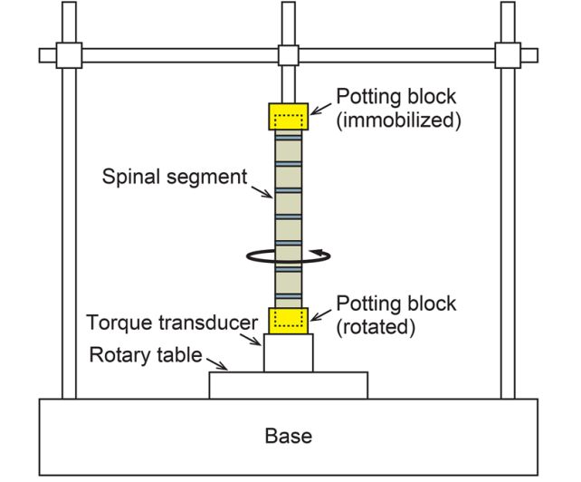 Each spine was divided into two regions: the thoracic vertebrae and the lumbar vertebrae. Then, each of the 10 spinal sections was placed in a torsion rig to literally test how far it could be twisted.