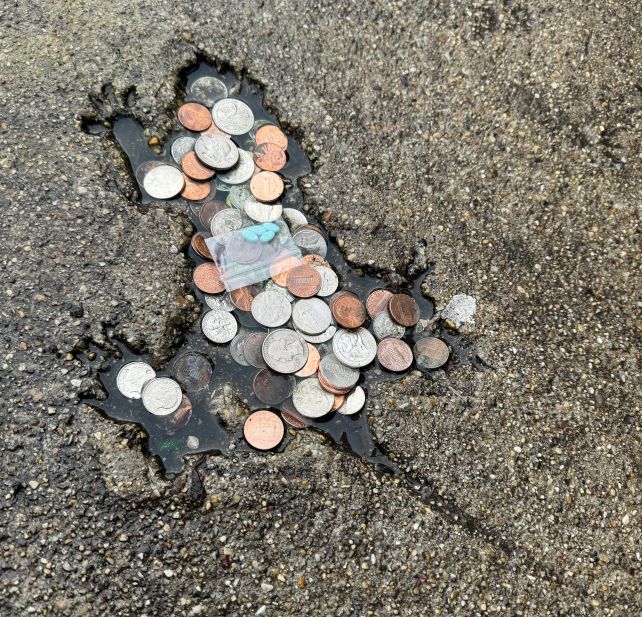 The Rat Hole filled with coins and a baggie of estrogen pills. (JunLpermode/Wikimedia Commons, CC0)