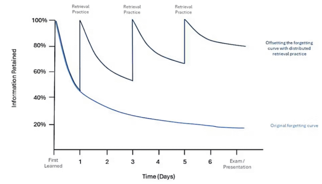 In the 19th century, German psychologist Hermann Ebbinghaus demonstrated how quickly we forget information after learning it. Within about 30 minutes, we lose roughly half of what we have learned, with much more fading over the next day. Ebbinghaus called this the forgetting curve. The light blue line on the chart below illustrates this.