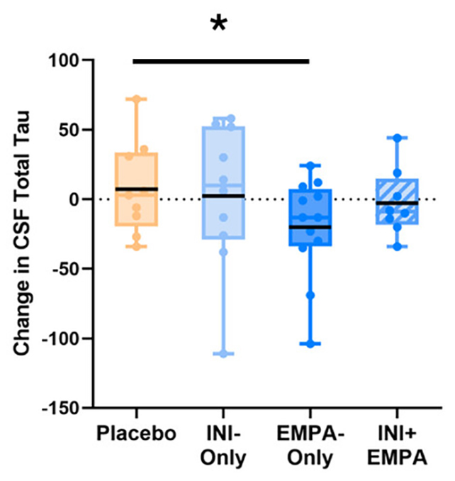 One of the benefits seen with empagliflozin (EMPA-Only) was signs of less tau build-up in cerebrospinal fluid (CSF). (Erichsen et al., A&D, 2025)