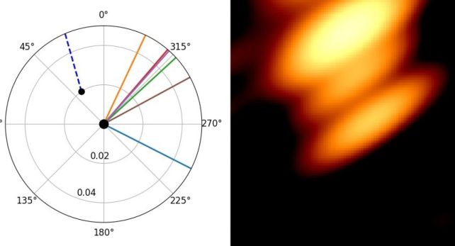 So, they went back to the RadioAstron map of the quasar's light and identified several features associated with the astrophysical jet from a feeding black hole. They also calculated how the motion of the secondary black hole would change the path of its jet.