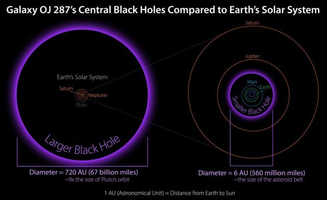 The relative sizes of the two supermassive black holes compared to the Solar System. (NASA/JPL-Caltech/R. Hurt/IPAC)