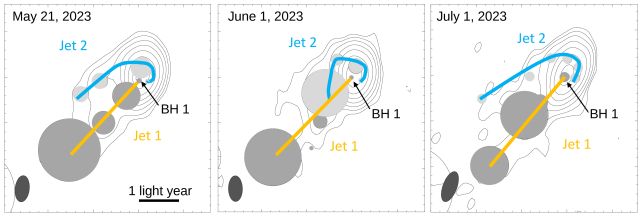 The team then modeled the motion they observed and concluded that the behavior is more easily explained by the presence of a second supermassive black hole. They found two periods in the fluctuating light. One was seven years, and the researchers found it consistent with a wobble in the jet system, like a teetering spinning top.